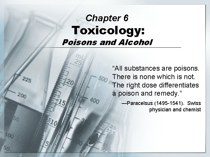 Chapter 6 Toxicology: Poisons and Alcohol "All substances are poisons. There is none which is not. The right dose differentiates a poison and remedy. " —Paracelsus (1495 -1541). Swiss physician and chemist