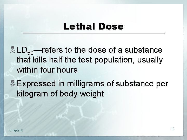 Lethal Dose N LD 50—refers to the dose of a substance that kills half the test population, usually within four hours N Expressed in milligrams of substance per kilogram of body weight Chapter 6 10