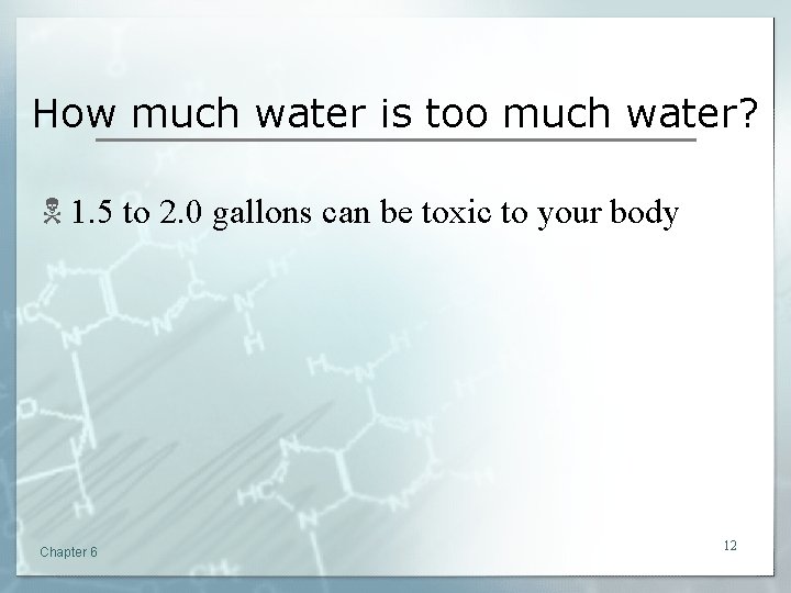 How much water is too much water? N 1. 5 to 2. 0 gallons can be toxic to your body Chapter 6 12