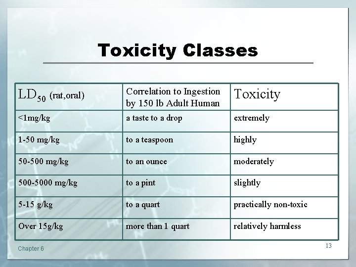 Toxicity Classes LD 50 (rat, oral) Correlation to Ingestion by 150 lb Adult Human Toxicity <1 mg/kg a taste to a drop extremely 1 -50 mg/kg to a teaspoon highly 50 -500 mg/kg to an ounce moderately 500 -5000 mg/kg to a pint slightly 5 -15 g/kg to a quart practically non-toxic Over 15 g/kg more than 1 quart relatively harmless Chapter 6 13