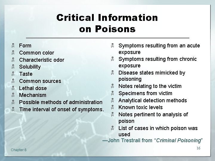 Critical Information on Poisons N N N N N Form Common color Characteristic odor Solubility Taste Common sources Lethal dose Mechanism Possible methods of administration Time interval of onset of symptoms. Chapter 6 N Symptoms resulting from an acute exposure N Symptoms resulting from chronic exposure N Disease states mimicked by poisoning N Notes relating to the victim N Specimens from victim N Analytical detection methods N Known toxic levels N Notes pertinent to analysis of poison N List of cases in which poison was used —John Trestrail from "Criminal Poisoning" 16