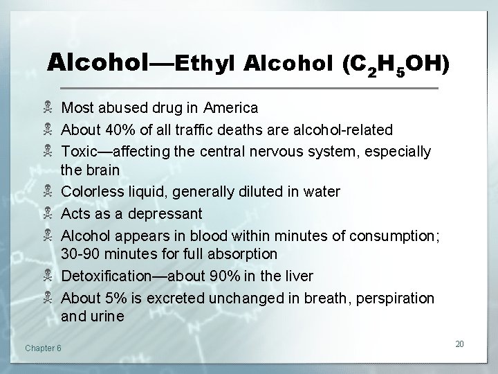 Alcohol—Ethyl Alcohol (C 2 H 5 OH) N Most abused drug in America N About 40% of all traffic deaths are alcohol-related N Toxic—affecting the central nervous system, especially N N N the brain Colorless liquid, generally diluted in water Acts as a depressant Alcohol appears in blood within minutes of consumption; 30 -90 minutes for full absorption Detoxification—about 90% in the liver About 5% is excreted unchanged in breath, perspiration and urine Chapter 6 20