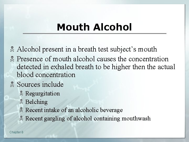 Mouth Alcohol N Alcohol present in a breath test subject's mouth N Presence of mouth alcohol causes the concentration detected in exhaled breath to be higher then the actual blood concentration N Sources include N Regurgitation N Belching N Recent intake of an alcoholic beverage N Recent gargling of alcohol containing mouthwash Chapter 6