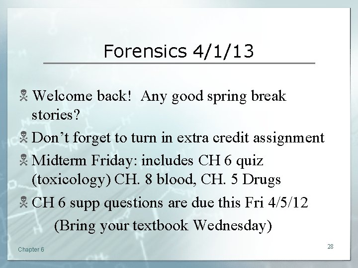 Forensics 4/1/13 N Welcome back! Any good spring break stories? N Don't forget to turn in extra credit assignment N Midterm Friday: includes CH 6 quiz (toxicology) CH. 8 blood, CH. 5 Drugs N CH 6 supp questions are due this Fri 4/5/12 (Bring your textbook Wednesday) Chapter 6 28