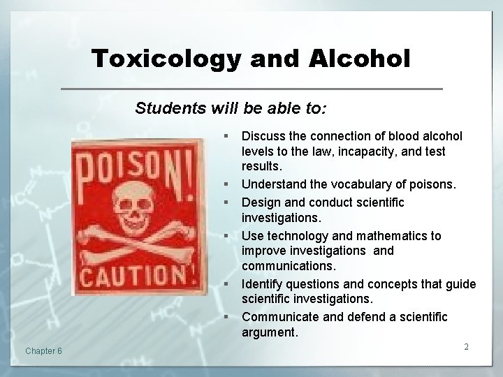 Toxicology and Alcohol Students will be able to: § § § Chapter 6 Discuss the connection of blood alcohol levels to the law, incapacity, and test results. Understand the vocabulary of poisons. Design and conduct scientific investigations. Use technology and mathematics to improve investigations and communications. Identify questions and concepts that guide scientific investigations. Communicate and defend a scientific argument. 2