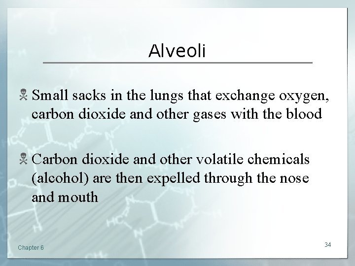Alveoli N Small sacks in the lungs that exchange oxygen, carbon dioxide and other gases with the blood N Carbon dioxide and other volatile chemicals (alcohol) are then expelled through the nose and mouth Chapter 6 34