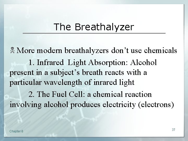 The Breathalyzer N More modern breathalyzers don't use chemicals 1. Infrared Light Absorption: Alcohol present in a subject's breath reacts with a particular wavelength of inrared light 2. The Fuel Cell: a chemical reaction involving alcohol produces electricity (electrons) Chapter 6 37