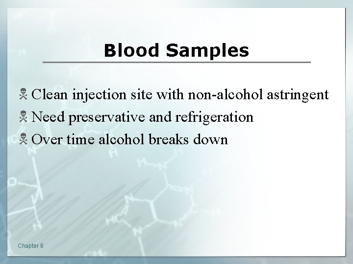 Blood Samples N Clean injection site with non-alcohol astringent N Need preservative and refrigeration N Over time alcohol breaks down Chapter 6