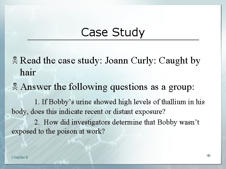 Case Study N Read the case study: Joann Curly: Caught by hair N Answer the following questions as a group: 1. If Bobby's urine showed high levels of thallium in his body, does this indicate recent or distant exposure? 2. How did investigators determine that Bobby wasn't exposed to the poison at work? Chapter 6 46