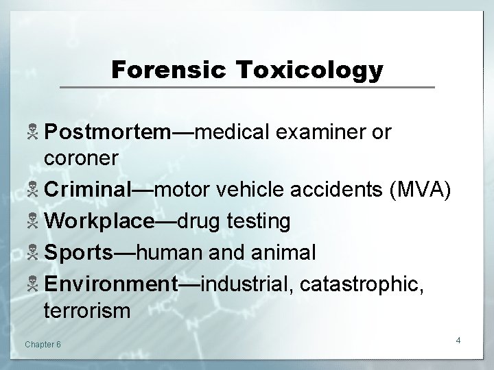Forensic Toxicology N Postmortem—medical examiner or coroner N Criminal—motor vehicle accidents (MVA) N Workplace—drug testing N Sports—human and animal N Environment—industrial, catastrophic, terrorism Chapter 6 4
