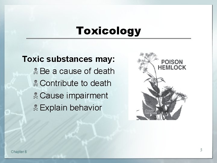 Toxicology Toxic substances may: N Be a cause of death N Contribute to death N Cause impairment N Explain behavior Chapter 6 5