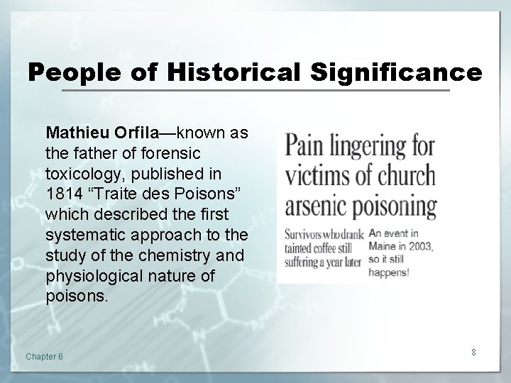 People of Historical Significance Mathieu Orfila—known as the father of forensic toxicology, published in 1814 "Traite des Poisons" which described the first systematic approach to the study of the chemistry and physiological nature of poisons. Chapter 6 8